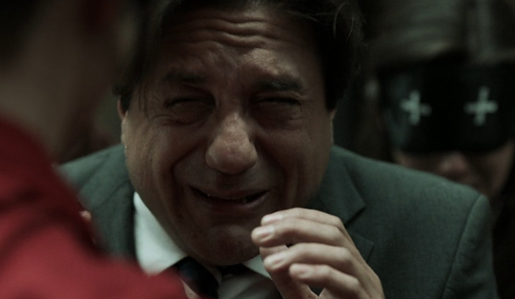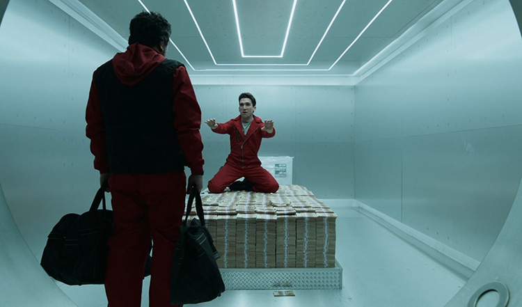 Pendant ce temps, dans les entrailles de la banque, Moscou réussit à à forcer l'accès au coffre-fort. Et là, son fils, Denver, nous présente alors toute l'étendue de sa connerie. Le gars se jette sur les liasses de billets et mime une scène de levrette... devant son père. Oui, tout à fait, devant son père.