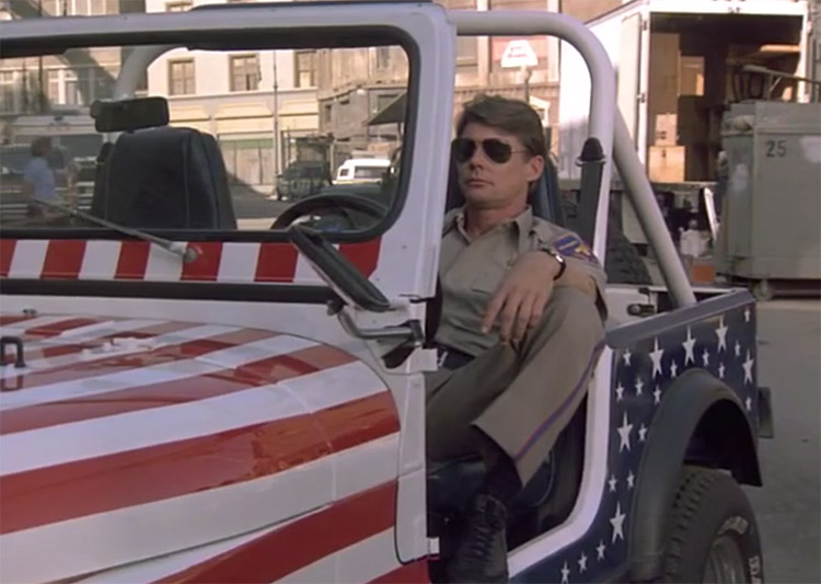 Ici, on apprend que notre antagoniste est prêt à tuer pour obtenir les faveurs d'une femme, une danseuse, plus précisément. Et une danseuse qui a manifestement le don de le rendre tout dur de partout. Il décide donc de la négocier autour d'une table avec les libyens. Eh oui, les femmes se monnayent contre quelques vils méfaits de guerre. Ah les années 80 !